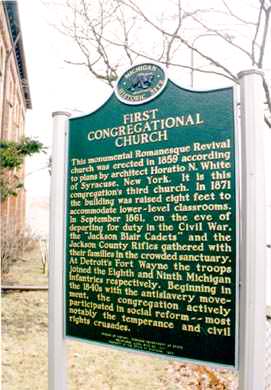 This monumental Romanesque Revival church was erected in 1859 according to plans by architect Horatio N. White of Syracuse, New York. It is this congregation's third church. In 1871 the building was raised eight feet to accommodate lower-level classrooms. In September 1861, on the eve of departing for duty in the Civil War, the "Jackson Blair Cadets" and the Jackson County Rifles gathered with their families in the crowded sanctuary. At Detroit's Fort Wayne the troops joined the Eighth and Ninth Michigan infantries respectively. Beginning in the 1840s with the antislavery movement, the congregation actively participated in social reform -- most notably the temperance and civil rights crusades. |