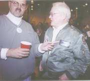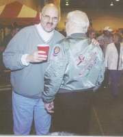 This guy had a neat jacket with some kind of WWII plane on the back of it. Here his buddy points out the emblem on the front. |