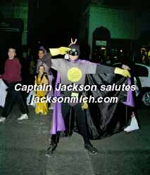 Photo #21 Our farewell shot for the evening is none other than Captain Jackson. Captain Jackson is rumored to be a public safety officer in real life, but that rumor has not been documented. We hope that the Captain (and You!) will sign the guestbook, or perhaps share a commentary with us of the strange events of Jackson's First Trunk or Treat. |