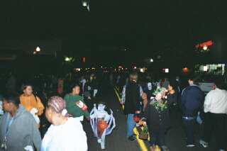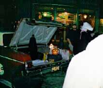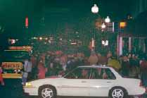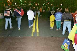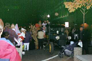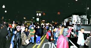 The crowd, although difficult to capture on film in the darkness, may be discerned in this carefully prepared photo which used high speed survelliance film. There were literally thousands of visitors at this first ever Trunk Or Treat. No one suspected the turn out, and candy givers were left empty handed not long after the event began. |