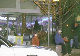 Hard to see even when this photo was enhanced to show him, a ghostly headless horseman roamed in the shadows of the sidewalk. It was not known if this creature was just a neighbor taking part in the planned event, or perhaps a real headless horseman that thought to camouflage his supernatural self on this appropriate evening. |